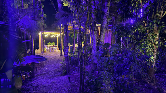 Cordões de luzes e iluminação cenográfica criam um ambiente mágico ao anoitecer